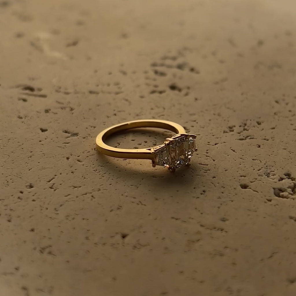 Trilogy emerald cut diamond engagement ring set with an emerald cut centre stone and two trapezoid cut side stones in 18ct yellow gold.