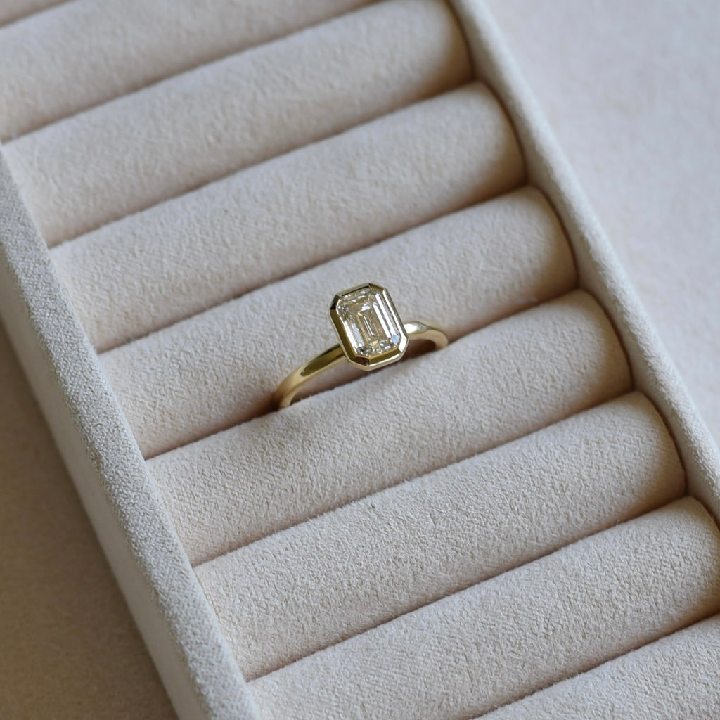 2.59ct emerald cut diamond engagement ring set in an 18ct yellow gold bezel setting with plunge detailing under the setting.