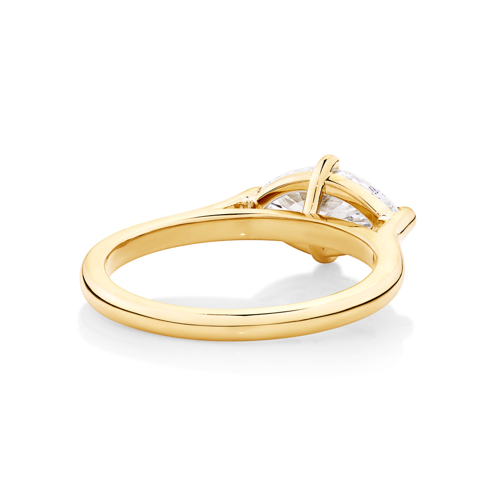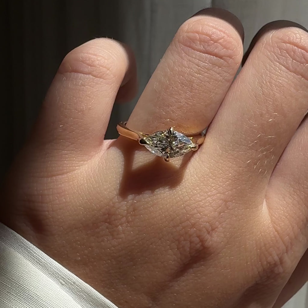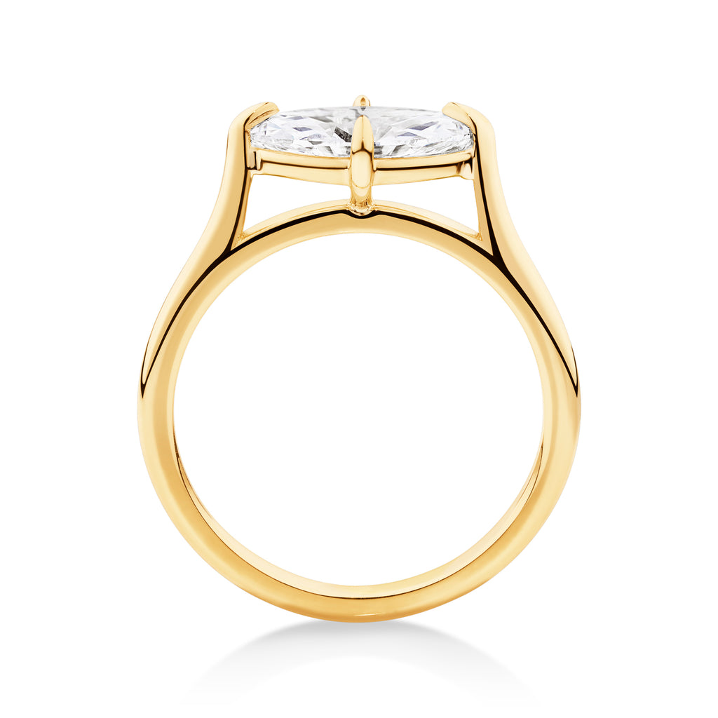 1.40ct marquise cut diamond engagement ring set in an east to west 18ct yellow gold four claw setting with cathedral shoulders.