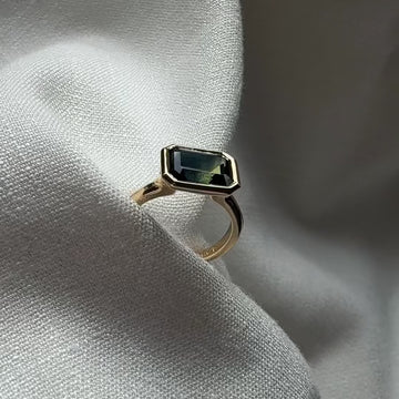 2,89ct natural Australian parti Sapphire with green and blue hues, set in an 18ct yellow gold east to west bezel setting.