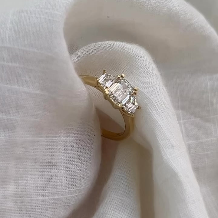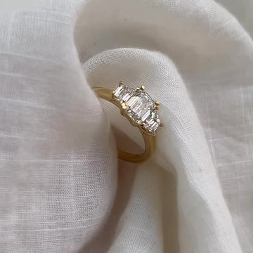 Trilogy emerald cut diamond engagement ring set with an emerald cut centre stone and two trapezoid cut side stones in 18ct yellow gold.