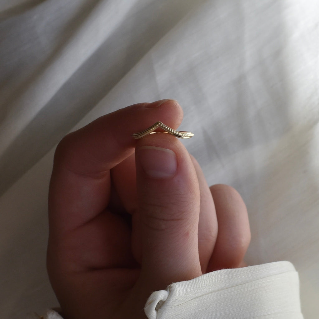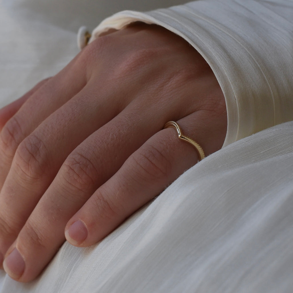 14cy yellow gold wishbone wedding band with milgrain detailing.