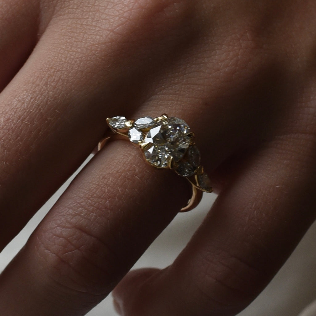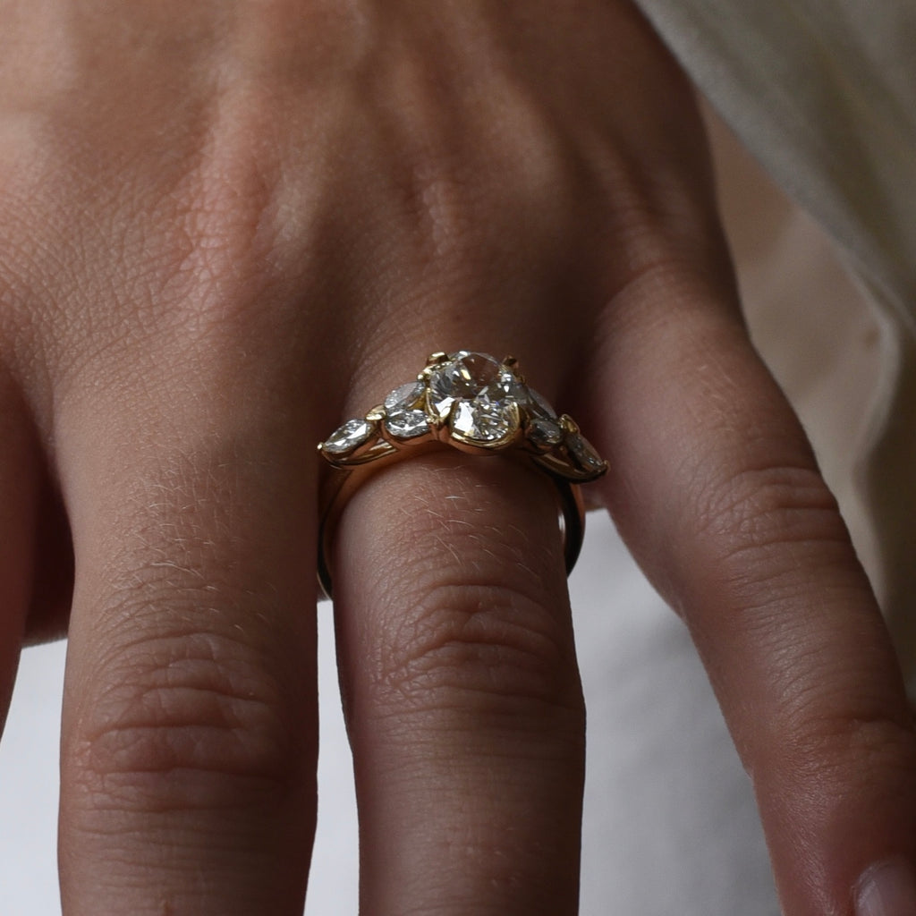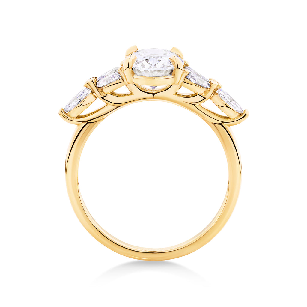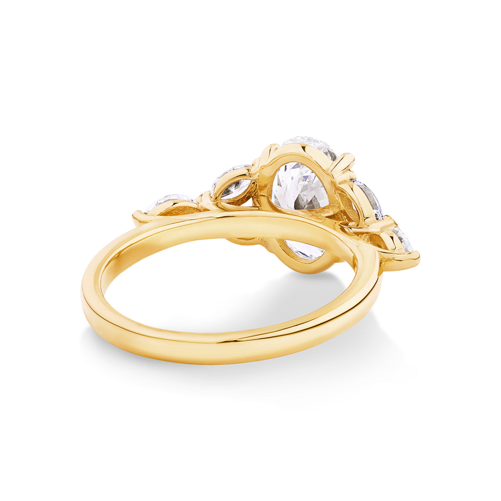2.04ct oval cut diamond engagement ring set in an 18ct yellow gold with six marquise cut side stones.