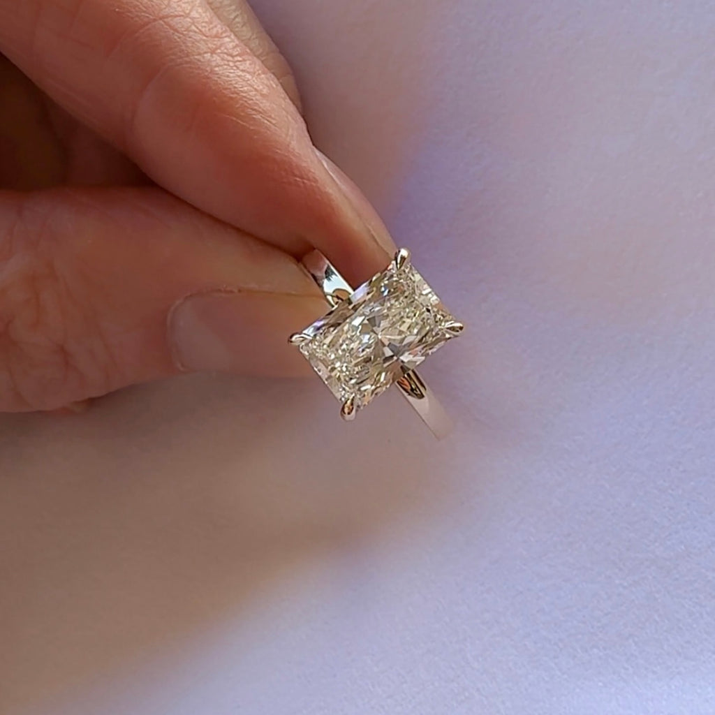 2.90ct radiant cut diamond engagement ring set in an 18ct white gold four claw setting.