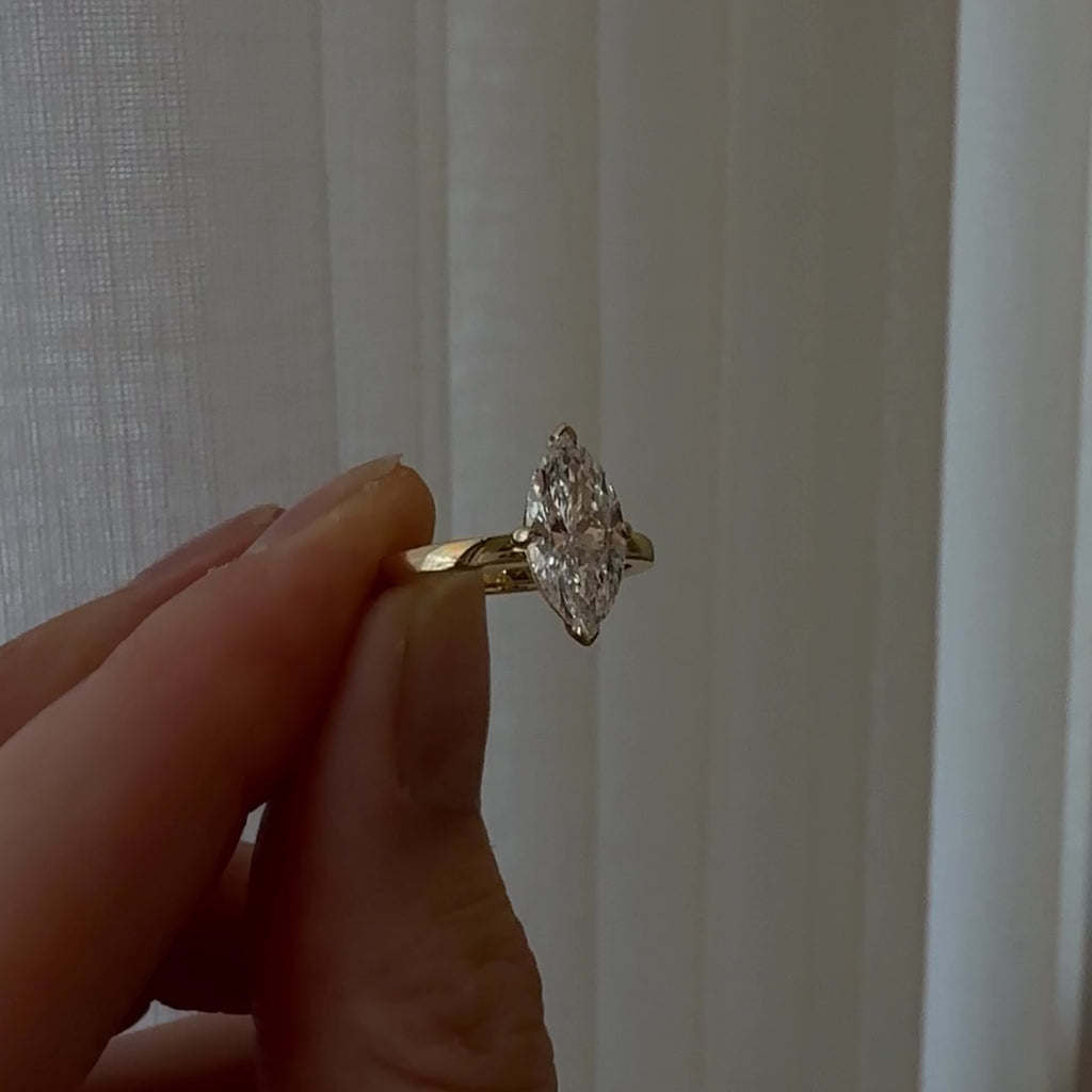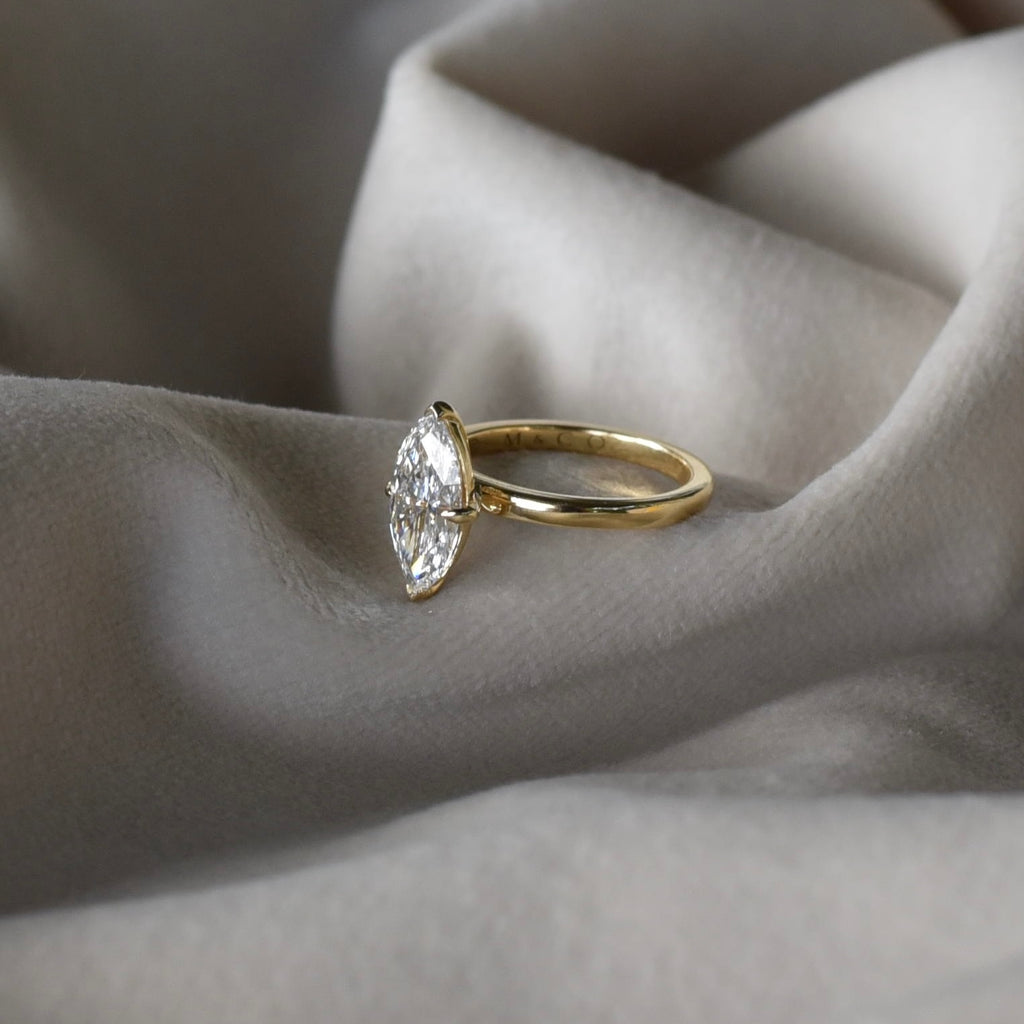 1.48ct marquise cut diamond engagement ring set in an 18ct yellow gold four claw setting with caps.